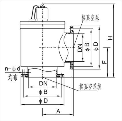 DYC-JQ型系列电磁真空压差式充气阀,是安装在机械真空泵上的专用阀门。安装于机械真空泵的进气口,并于泵同步开启和关闭。当泵停止工作或电源突然中断时,阀门能依靠大气与真空的压差力使阀板自动关闭,将真空系统封闭,保持其真空度,并将大气通过阀的节流孔充入泵腔内,从而避免泵油逆流污染真空系统。